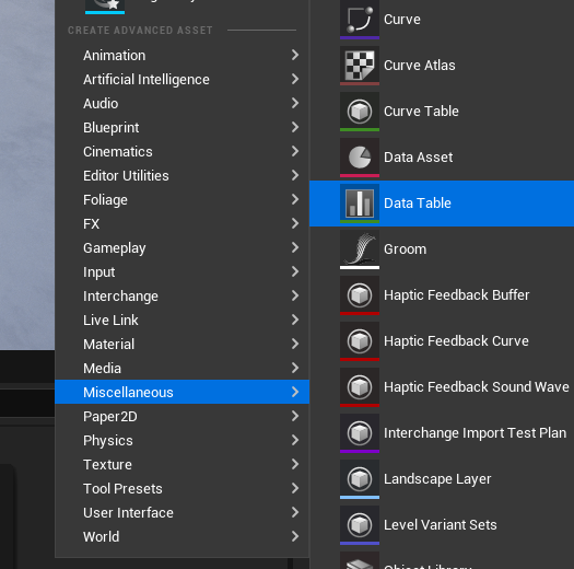 언리얼 에디터를 켜서 Content Browser에서 아래와 같이 Data Table을 만든다.