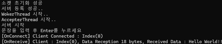 `IOCPServer` 클래스에서 `EchoServer` 클래스로 정보를 전달하고 콘솔(애플리케이션)에서 해당 내용을 띄워주도록 구현.