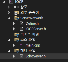 `IOCompletionPort.h`를 `IOCPServer.h`로 이름을 변경하고 `Define.h`와 함께 `ServerNetwork` 필터로 이동.